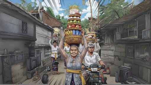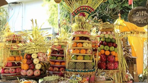 Kalau parcel dan hamper ‘kan harus dibungkus rapi, gebogan (nama lain: Pajegan) harus disusun rapi. Isinya juga menyesuaikan budget kita, asalkan tulus ikhlas saja. Ada buah-buahan dan jajan khas Bali, pokoknya serba lokal.
