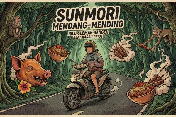 Minggu pagi di Bali itu kastanya terbagi dua. Ada kasta Moge (Motor Gede) yang sunmori-nya ke Kintamani sambil pamer outfit jutaan, dan ada kasta kita: Kaum Beat Karbu. Kalau dompetmu lagi ngap-ngapan tapi butuh healing, lupakan Kintamani. Gas tipis-tipis ke arah Sangeh. Udaranya sama-sama dingin, tapi harga makanannya jauh lebih masuk akal buat UMR Bali….