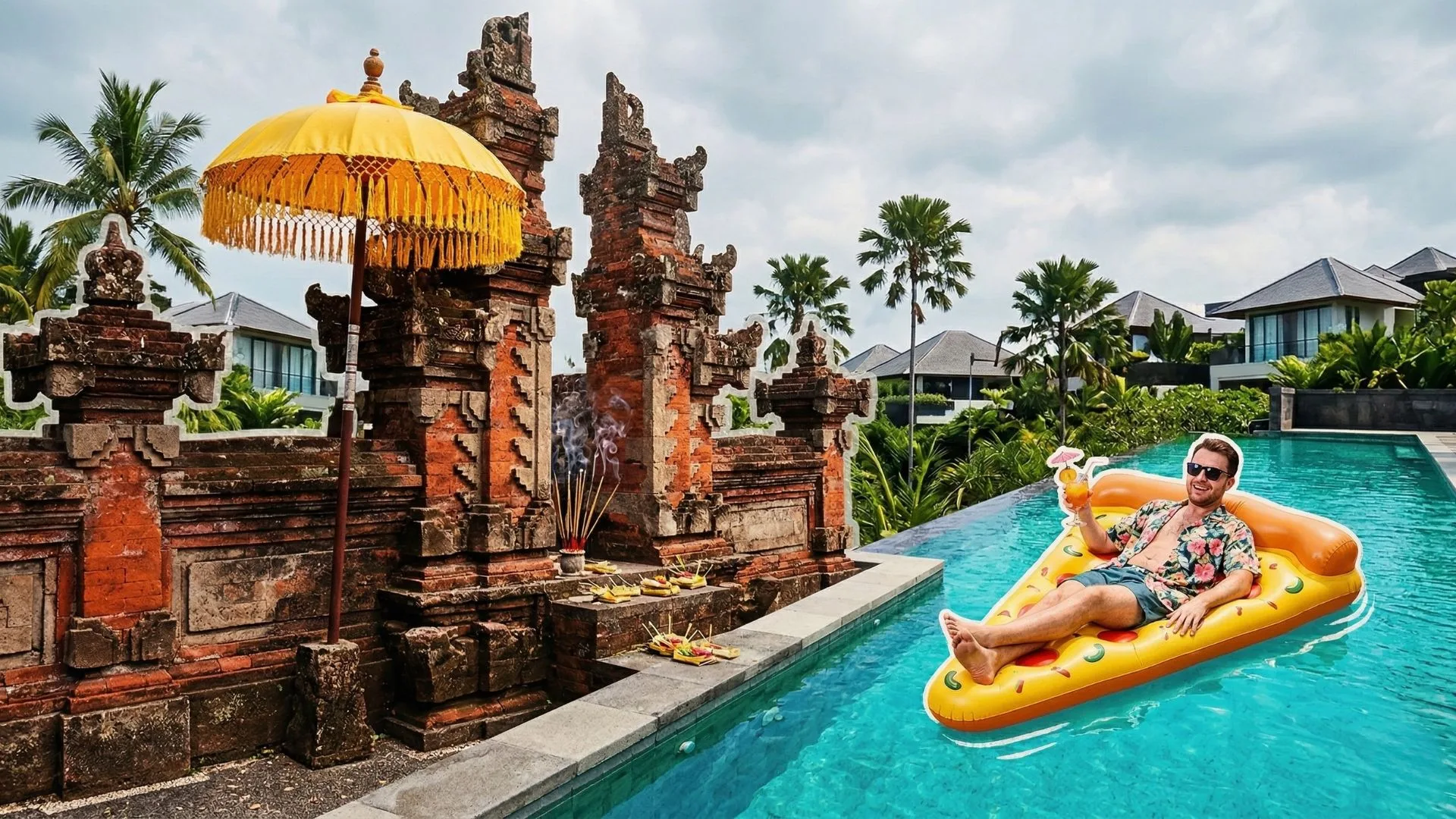 Coba jalan-jalan ke area Canggu, Pererenan, atau masuk ke gang-gang kecil di Ubud. Pemandangan apa yang paling sering Khe lihat? Tembok bata merah khas angkul-angkul Bali, tapi di dalamnya ada kolam renang estetik, bean bag, dan bule lagi sunbathing.